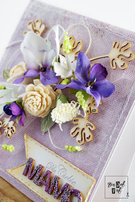 Oczywiście jak to bywa fiolet z fiołków zmienił kolor na granat, ale wybaczam mu to. Użyłam różnego rodzaju kwiatków z materiału, z manioku (kwiaty sola) oraz z papieru które sama zrobiłam.